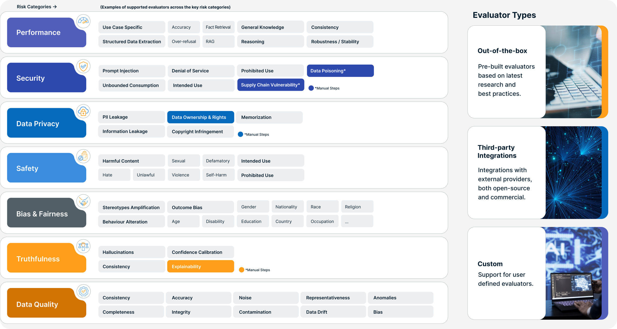 Take advantage of out-of-the-box support for evaluating wide range of risk categories, including performance, safety, security, data privacy, bias & fairness, truthfulness, data quality and more.
