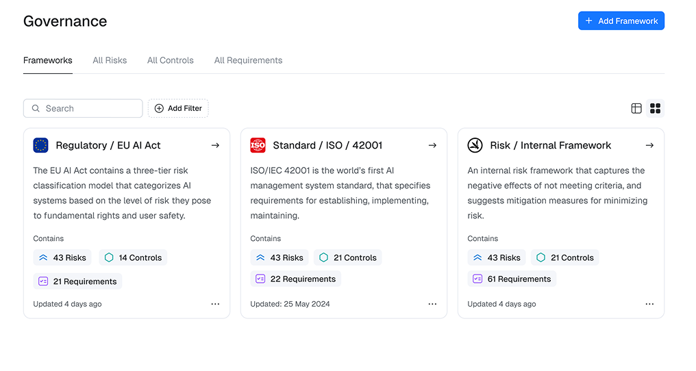 Hit the ground running with pre-packaged frameworks covering regulatory and industry requirements from a wide range of sources, including EU AI Act, FINMA, MAS, OWASP, NIST AI RMF, ISO standards, industry best practices as well as latest research.